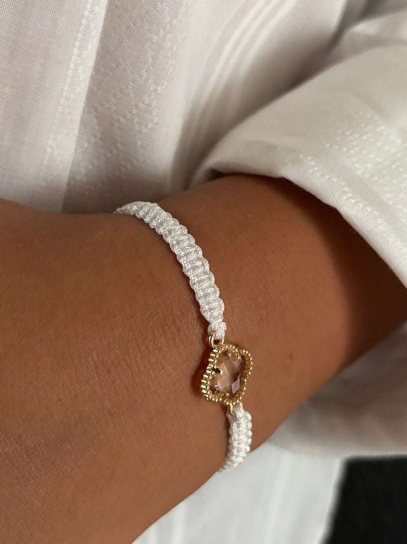 Das Armband Élanor verbindet kunstvolle Makramee-Knotenarbeit mit einem feinen goldfarbenen Kleeblatt, das als stilvo...